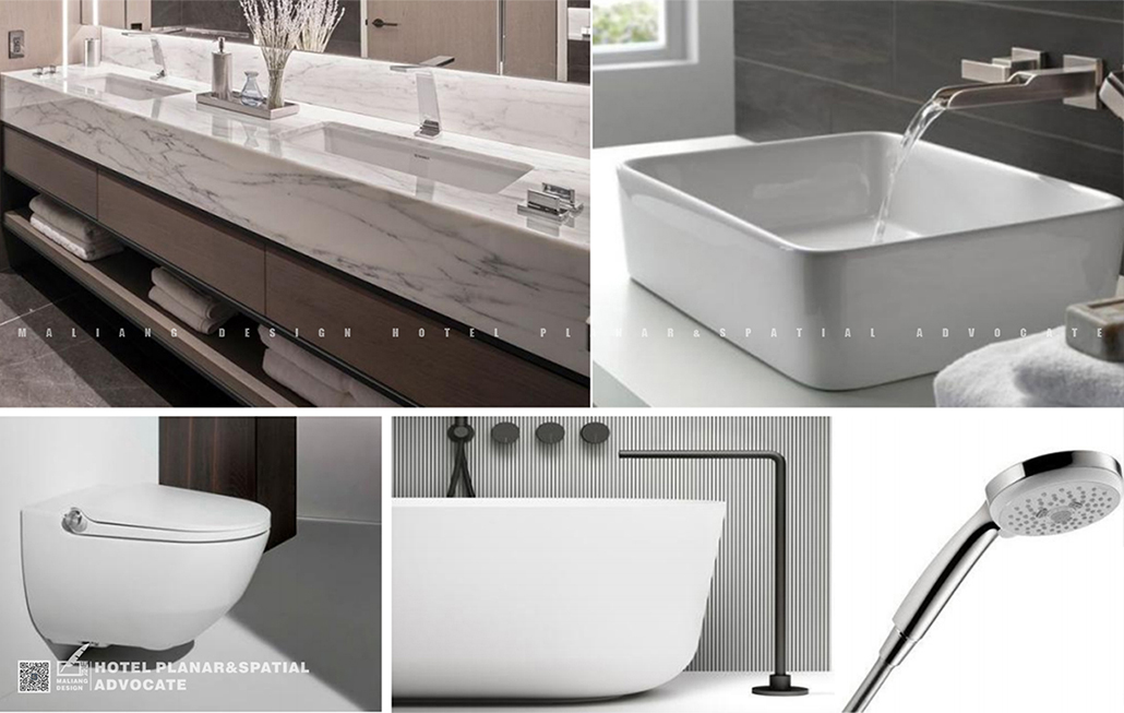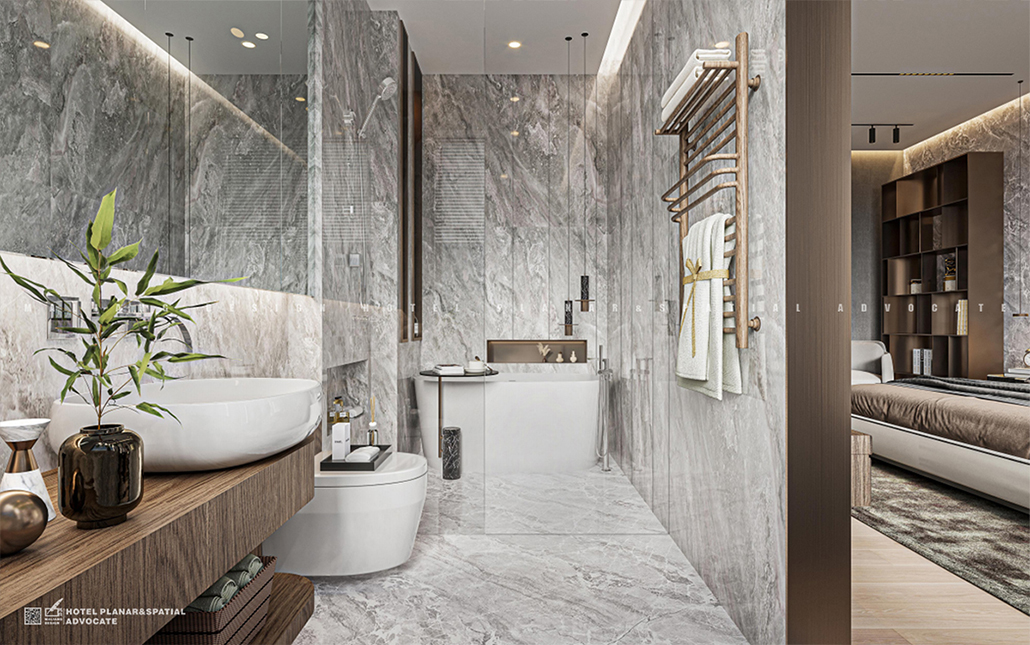 The master bedroom is equipped with a private bathroom, with gray white ceramic tiles, washing table, intelligent toilet and bathtub. It is fashionable, free and open, presenting a fresh and elegant style.