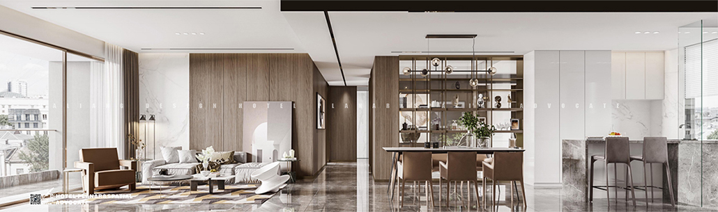 過道將客廳與餐廳分割開來,其左側是明亮、清晰的客廳和茶室以及陽臺的位置,右側則是餐廳和廚房。
