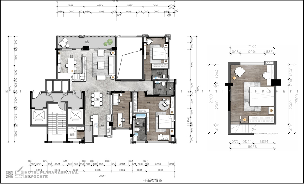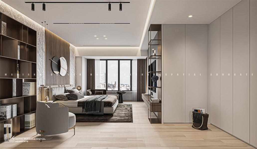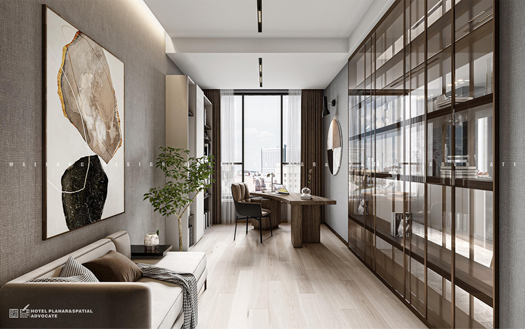 The bedroom and study are paved with wooden floor to create a quiet and natural space style. The art tea table and the Royal chair are placed near the window. The edge table, single sofa, plastic sculpture, floor lamp, Art Chandelier and other elements orderly place the whole space, and the modern sense of art fills the whole room.
