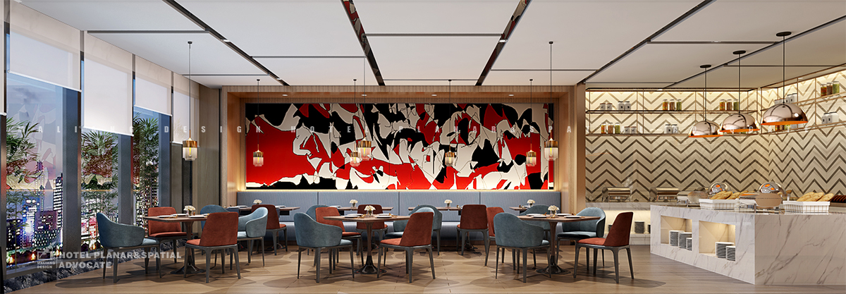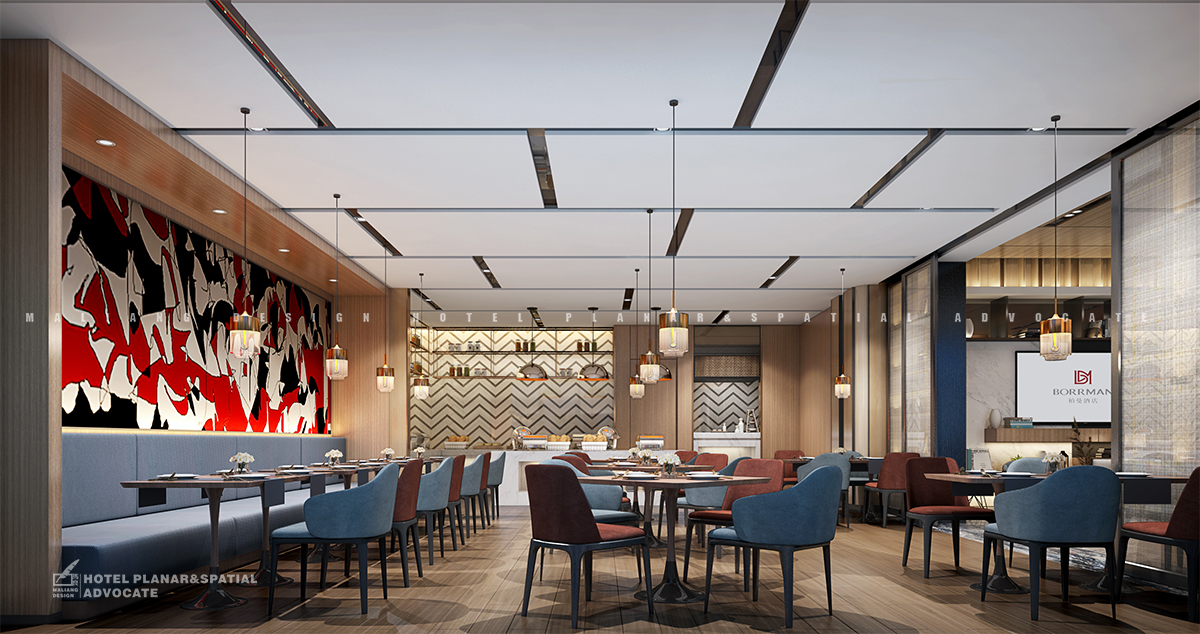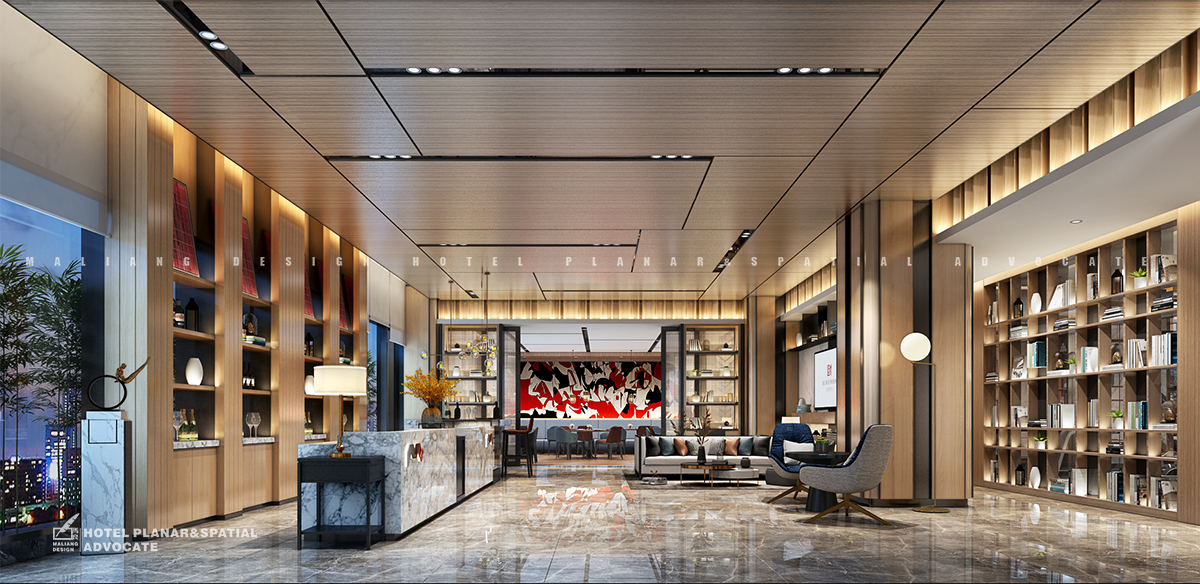 立身與大堂之中,不難感受到大堂整體的大氣、沈穩以及高品位的氣質。放眼望去是整體的深咖啡色調裝飾,引人眼球的是獨特而抽象的黑紅相間的壁畫,有畫龍點睛之感。