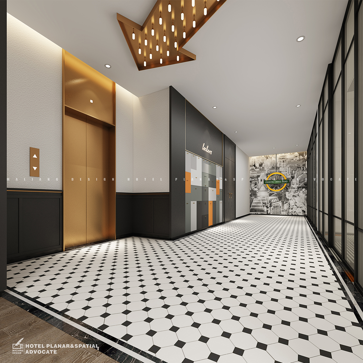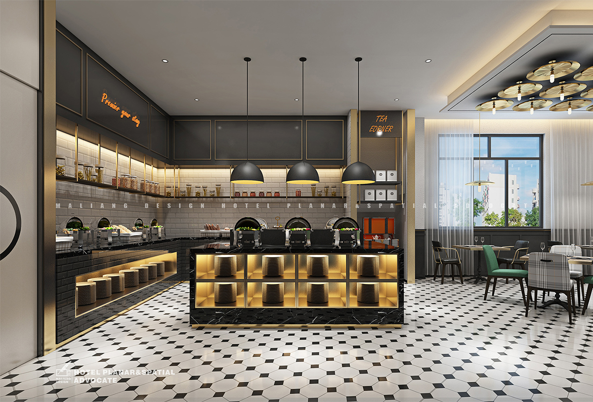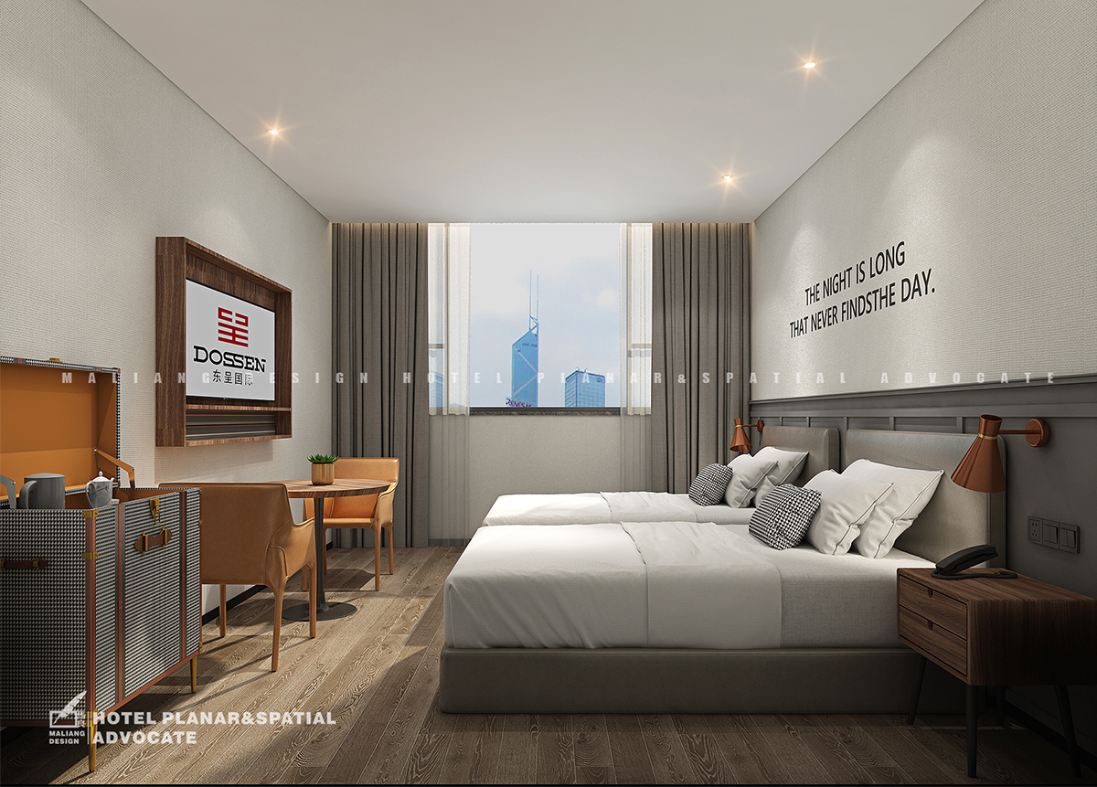 The laying of elevator hall and guest room elevator room is the same as that of restaurant, but the difference is that the aesthetic pattern is added to the wall. This pattern will extend to the hallways of guest rooms and the walls of all guest rooms.