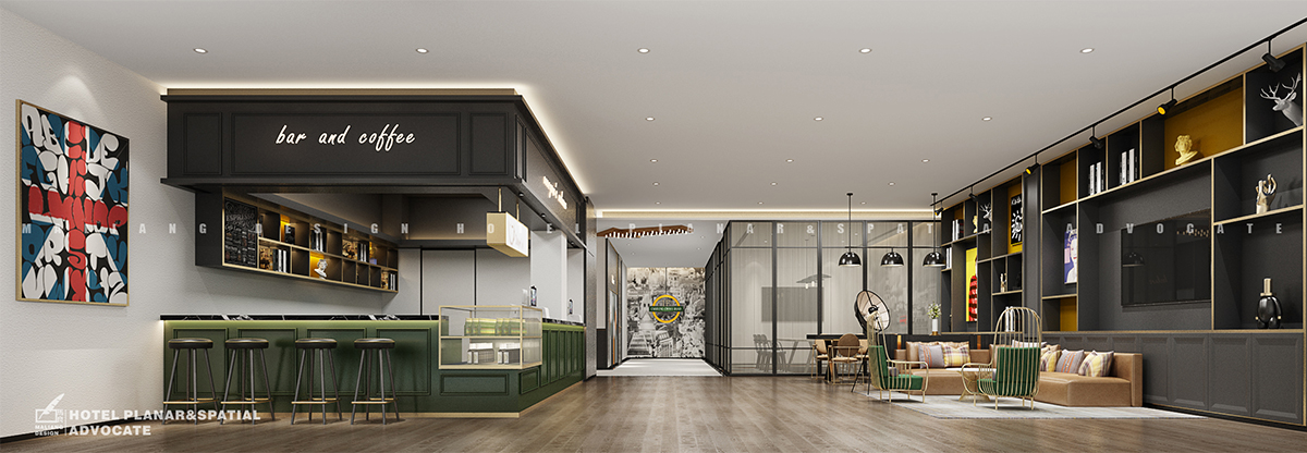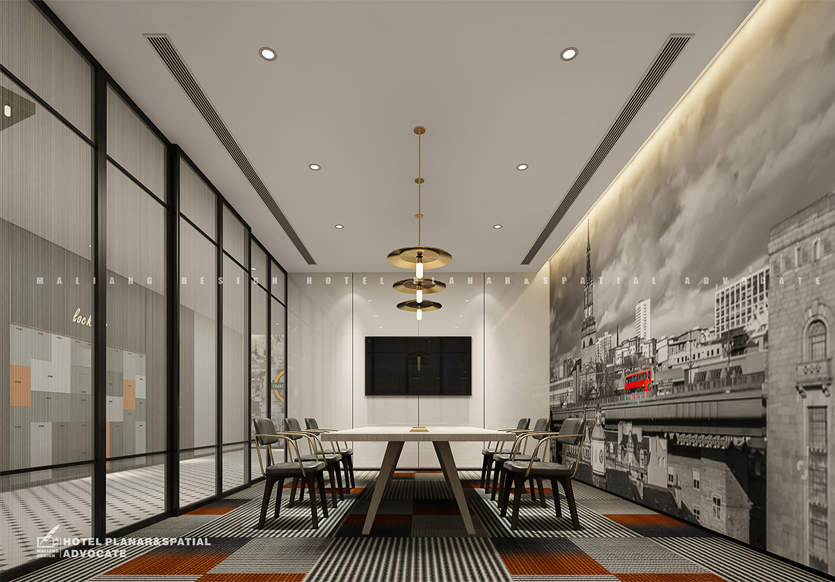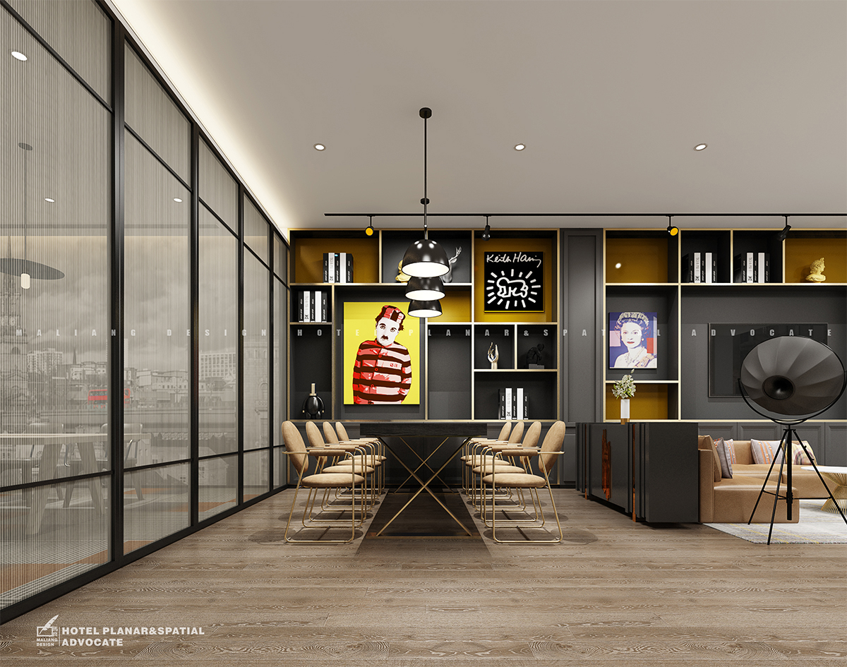 The wooden brick is covered with the whole hall, the front desk is on the left and the reception area on the right. On both sides of the wall are decorated with ornaments, including deer head, figure statue, poster, books, etc., which makes the top of the simple white, such as the light of dots, which makes the modern minimalist and fashion watch to the extreme. Separated from the reception area is the lobby meeting room.The decoration of the front desk on the left side is similar to that on the right side, but the "meter" pattern on the wall is quite unique.